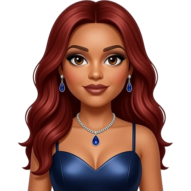 Traci Braxton from The Braxtons with dark brown eyes, long red hair, black eyeshadow, dark brown lipstick, dark indigo metallic sweetheart dress, necklace and earrings emoji