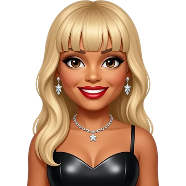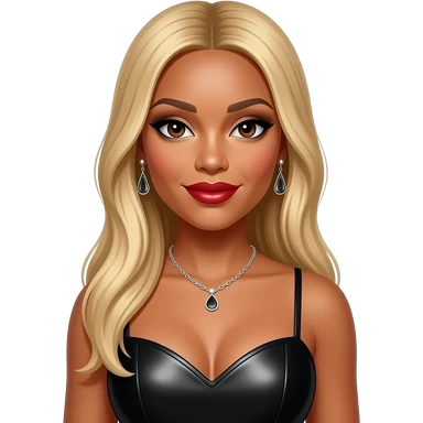Tamar Braxton from The Braxtons with dark brown eyes, long blonde bang hair, black eyeshadow, red lipstick, black metallic sweetheart dress, necklace and earrings emoji