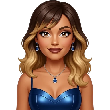 Towanda Braxton from The Braxtons with dark brown eyes, long dark brown bang hair with blonde ombre, black eyeshadow, dark brown lipstick, dark indigo metallic sweetheart dress, necklace and earrings emoji
