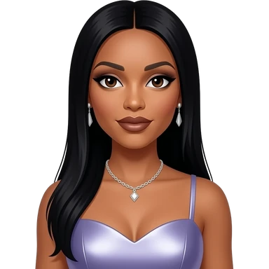 Toni Braxton from The Braxtons with dark brown eyes, long black straight hair, black eyeshadow, brown lipstick, periwinkle metallic sweetheart dress, necklace and earrings emoji