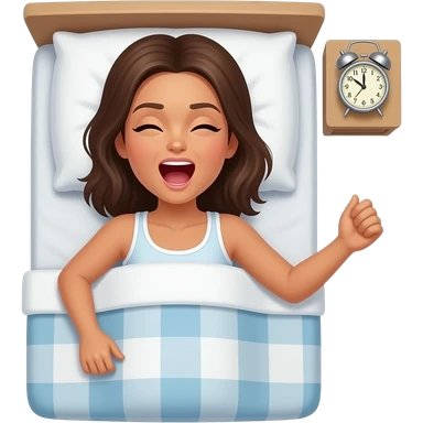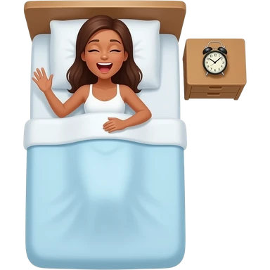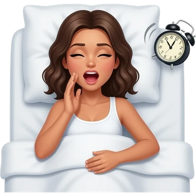 top view of a tanned shirtless woman waking up in bed yawning with an alarm clock ringing at the bedside emoji