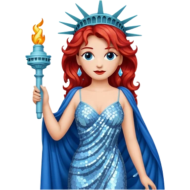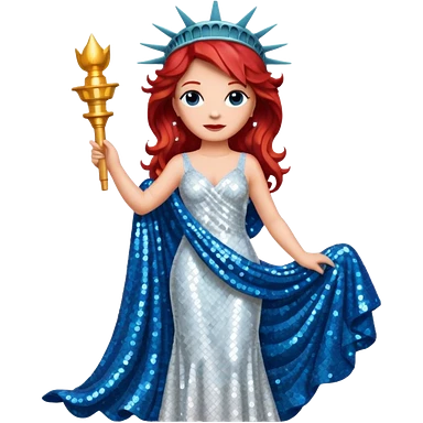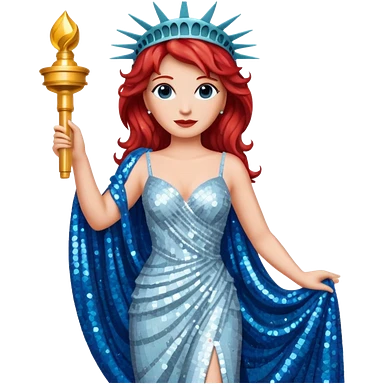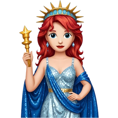 Lady Liberty from Film Studios with red wavy hair, white sequin gown, blue sequin drape emoji