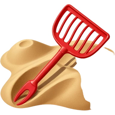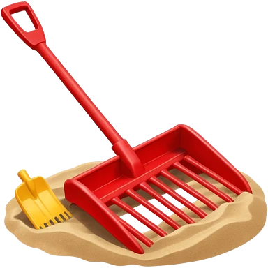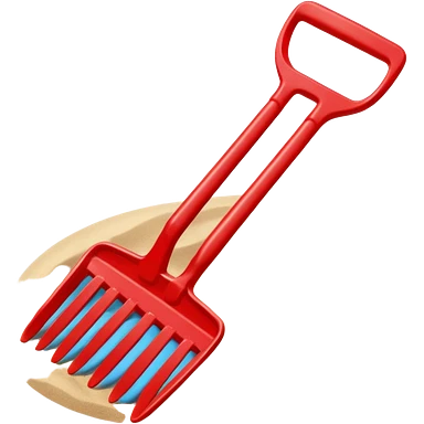 Red plastic shovel and rake in sand emoji
