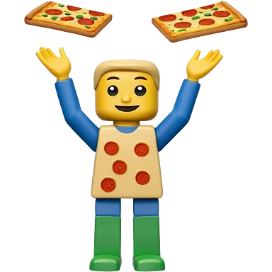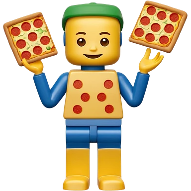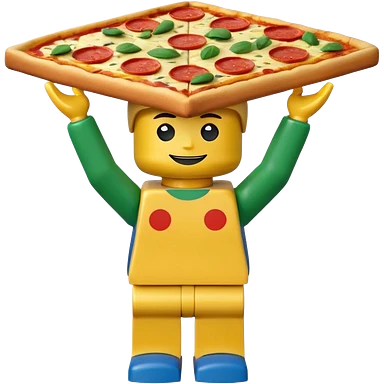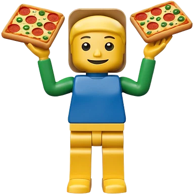 Minifigure: yellow square head blue square troso rectangular yellow arms and green legs with a pizza on the head emoji