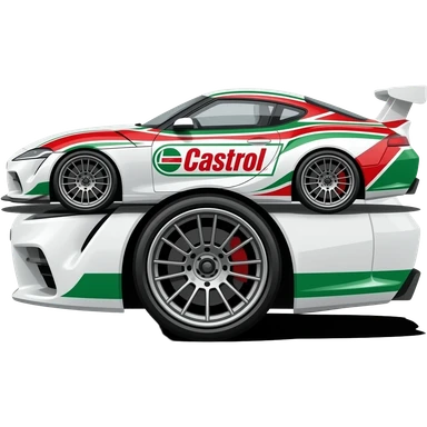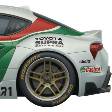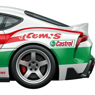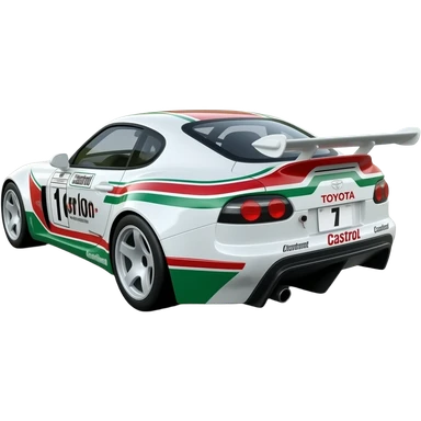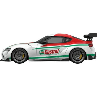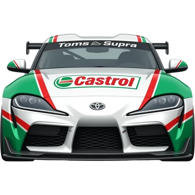 Toyota supra race car, toms supra, castrol, White, red, green, replica of original race livery ,racing type view emoji