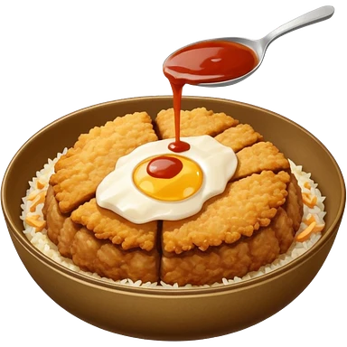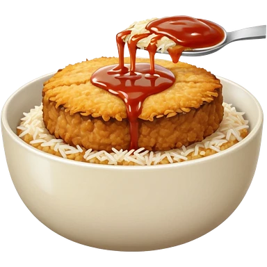 katsudon in a bowl: bowl filled with rice, a bit of sauce over the rice and a breaded pork cutlet emoji