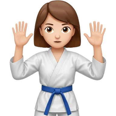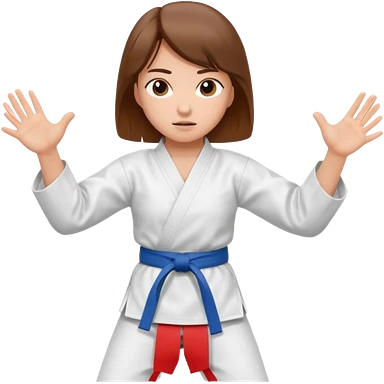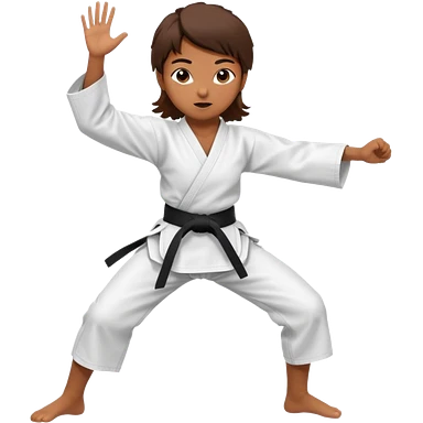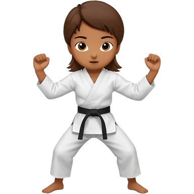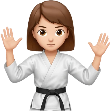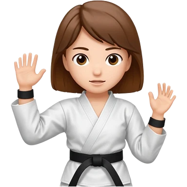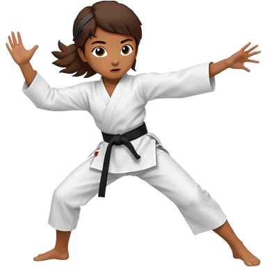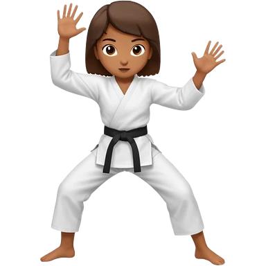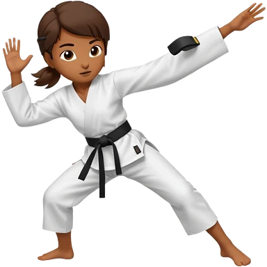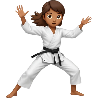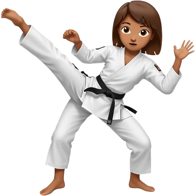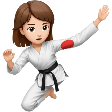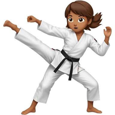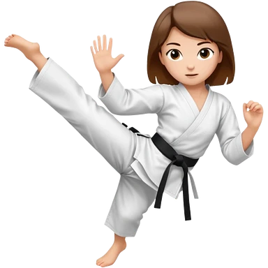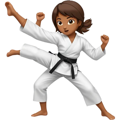 Ragazza castana che pratica karate, ha la cintura nera ed io tradizionale kimono bianco del karate, tira un calcio laterale oppure un pugno oppure è in posizione di guardia emoji