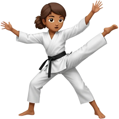 Ragazza castana che pratica karate, ha la cintura nera ed io tradizionale kimono bianco del karate, tira un calcio laterale emoji