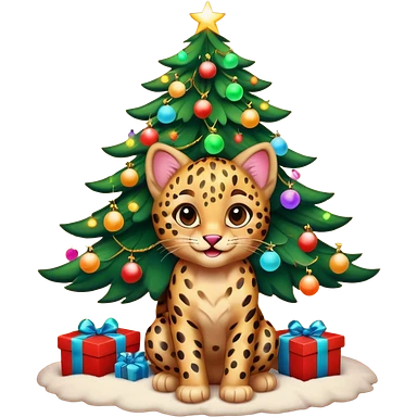 Smiling Leopard kitten under a multicolored lighted glowing christmas 🎄 emoji