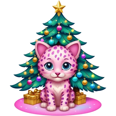 Smiling Pink Leopard kitten under a multicolored lighted glowing christmas 🎄 with a gold sign emoji