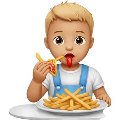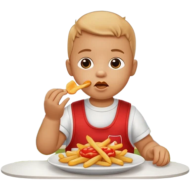 Transformer cette personne en bébé occuper à manger des fritte a bruxelles, devant latomium emoji | AI Emoji Generator