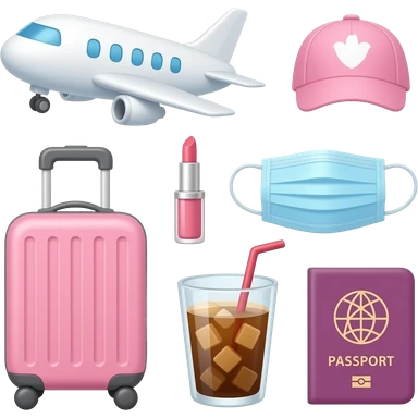 aesthetic, pink, cute, travel emojis (airplane, luggage, face mask, lip gloss, iced coffee, passport, travel essentials) emoji