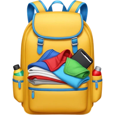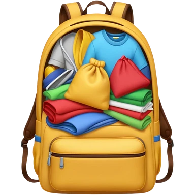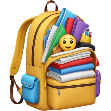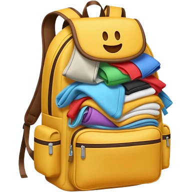 Emoji-style backpack overflowing with clothes, rounded cute shapes, soft shadows, colorful emoji