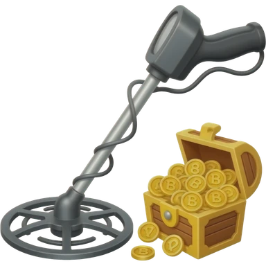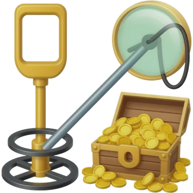An icon featuring a treasure chest partially open, revealing gold coins and jewels. A metal detector and a shovel are nearby, symbolizing the excitement of treasure hunting. The design evokes adventure, exploration, and the thrill of discovering hidden treasures. transparent background. emoji