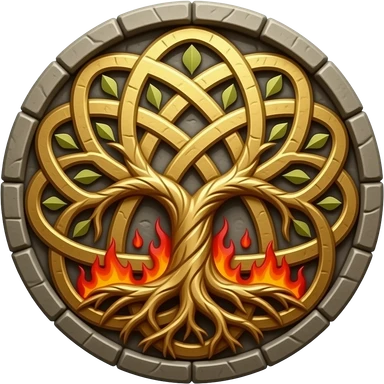 Tree of Life emblem, ancient symbol with halfway fire blazing up emoji