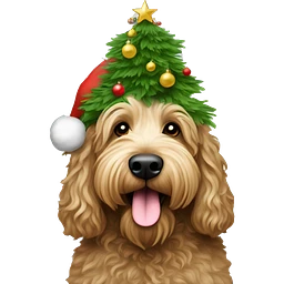 Brown, beige colored Maltipoo with Christmas hat and Christmas tree Christmas lights and a brown haired boy and blond long haired girl human in the background emoji