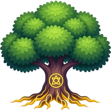 The Root (🌳): “Ancient tree with strong green leaves and deep purple trunk, golden yellow roots glowing, grounded mystical symbol, clean flat illustration” emoji