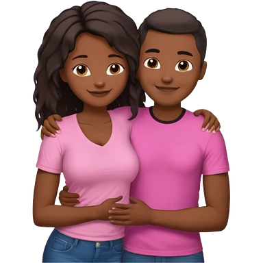 Black lesbian couple with one dark skin masculine with short hair low cut fade with a t shirt and one feminine with very long hair in a pink blouse hugging emoji