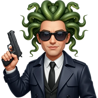 Medusa in trenchcoat with sunglasses holding gun emoji