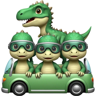 Tres dinosaurios bebés grises subidos en un carro tecnológico blanco con lentes de realidad virtual emoji