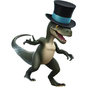 green t-rex dinosaur surfing on a pint and white surfboard with a pink tutu on emoji
