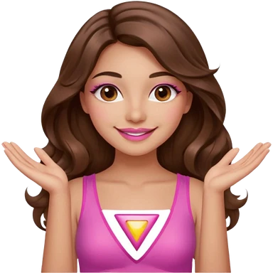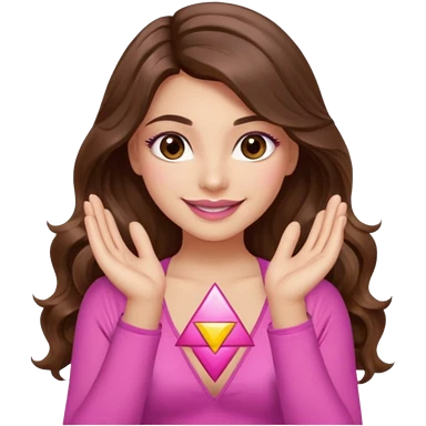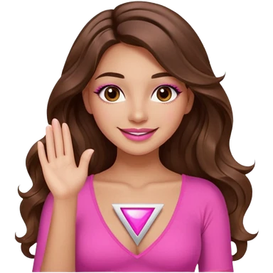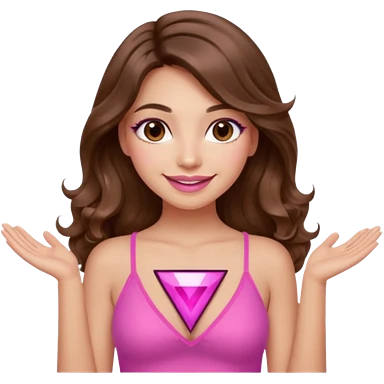 girl with long wavy brown hair, brown eyes, long lashes, sexy pink lips, light to medium complexion, wearing a pink sexy top, smiling, hands together in a tryangle emoji
