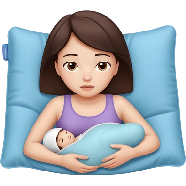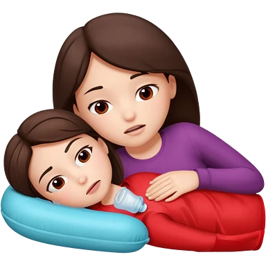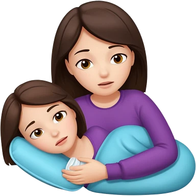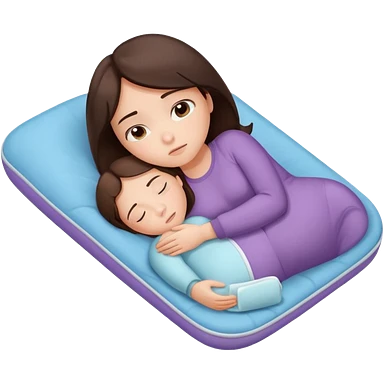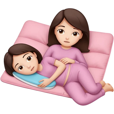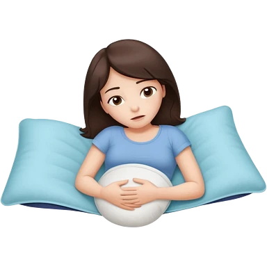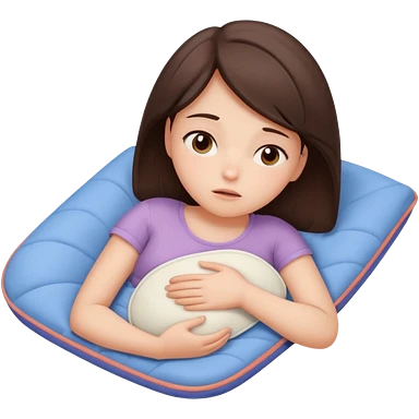 a brunette girl lying down on her side, holding a warm heating pad against her lower belly. She's uncomfortable and sad, her posture should show she’s having menstrual cramps. Use simple lines, rounded shapes, soft colors, and a clean emoji aesthetic. Make it expressive but still adorable emoji