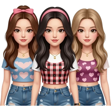 trio de amigas, una con pelo rubio largo liso y ojos azules, otra chica con pelo negro y largo con ojos marrones y otra chica más delgada con pelo castaño pelirrojo y rizado emoji