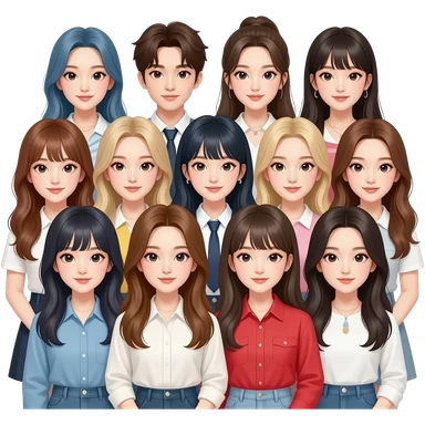 trio de amigas, una con pelo rubio largo liso y ojos azules, otra chica con pelo negro y largo con ojos marrones y otra chica más delgada con pelo castaño pelirrojo y rizado emoji