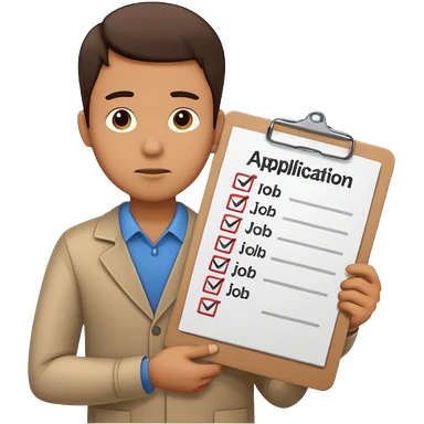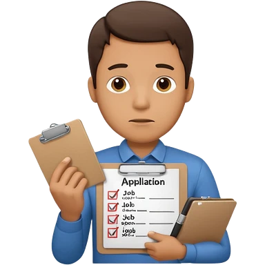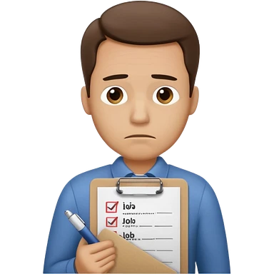 Man looking sad while holding a clipboard with a checklist that has a heading that says job application emoji