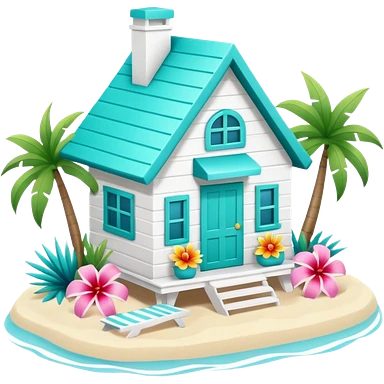 cute beach house, turquoise and white, colorful details, tropical flowers, 3D cartoon, mobile game icon style, clean background, no text, no watermark emoji