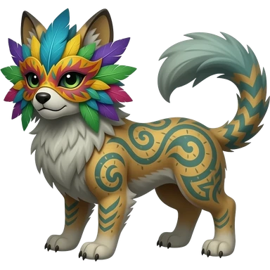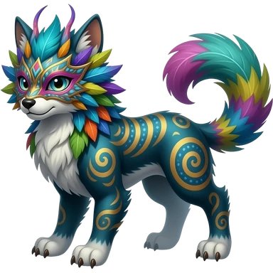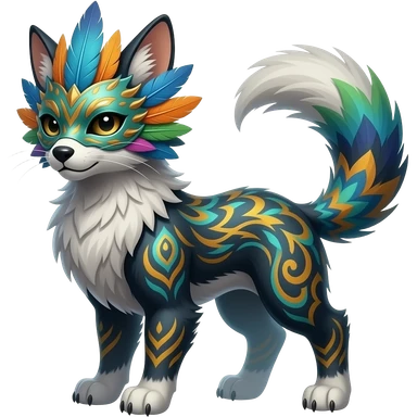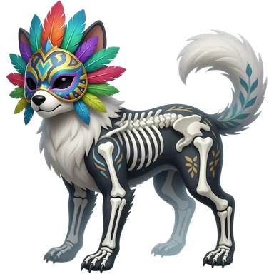 Tropical colorful feathered-masked white-skeletal gloomy foggy eldritch beautiful realistic edgy fantasy vernid-sergal-fursona animal creature with a tufted tail full body with intricate markings emoji