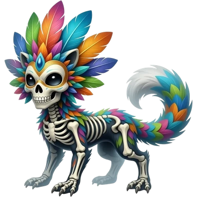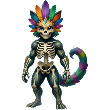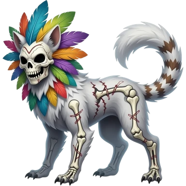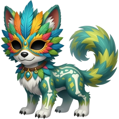 Tropical colorful feathered-masked white-skeletal gloomy foggy eldritch beautiful realistic edgy fantasy ghoul-like stitched vernid-sergal-fursona animal creature with a tufted tail full body with intricate markings emoji