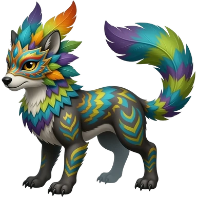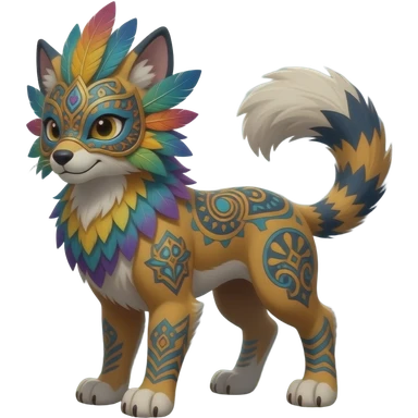 Tropical feathery shamanic cultural Greenish beautiful handsome gorgeous aesthetic colorful vibrant Vernid-Trico-species-Fakemon-creature by LiLaiRa, 4 legs, 1 tail, random markings, (full body) emoji