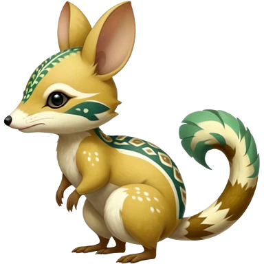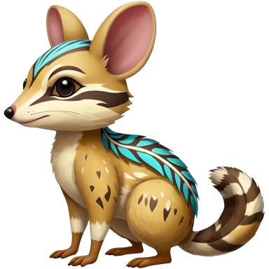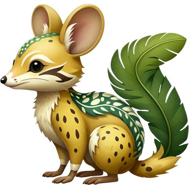 Tropical Exotic Colorful Beige-yellow, Jade-green, white specks, Floral Feathery Numbat-Bilby-Quoll-Furret-Fakémon-furry-fursona-creature (full body) with tribal markings emoji