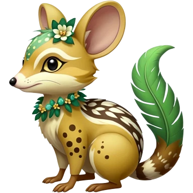 Tropical Exotic Colorful Beige-yellow, Jade-green, brown back-mane, white specks, Floral Feathery Numbat-Bilby-Quoll-Furret-Fakémon-furry-fursona-creature (full body) with tribal markings emoji