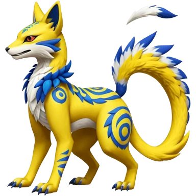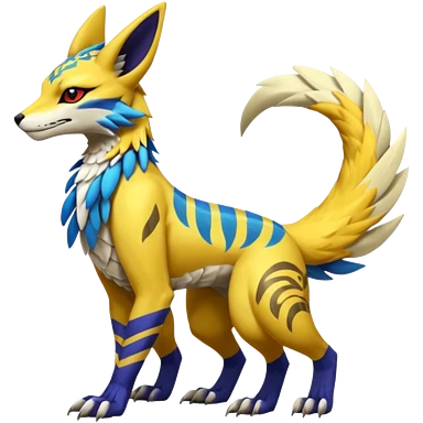 Tropical Tiny Marked Patterned Tribal Garurumon-Meloetta-Renamon-fusion-hybrid-creature (full body) emoji