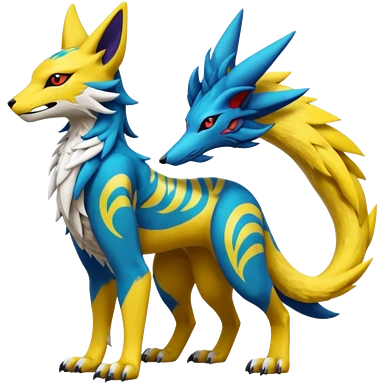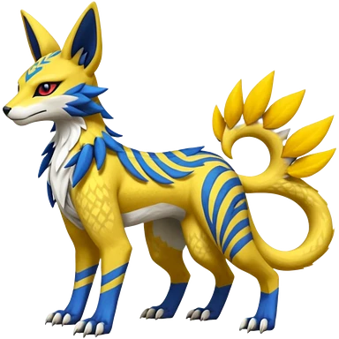 Shiny tropical exciting earthly madly feral 4-legged Feral Lightning-patterned Zig-zagged buzzy fuzzy Meloetta-Renamon-Zeraora-Luxray-Cobalion-Suicune-Vernid-fusion-hybrid-creature, full body emoji