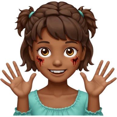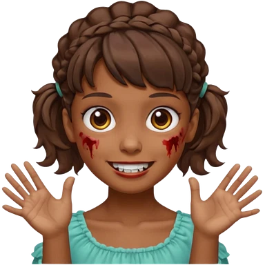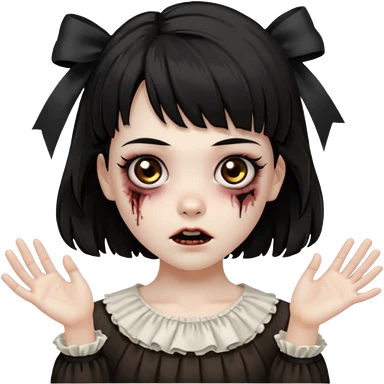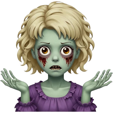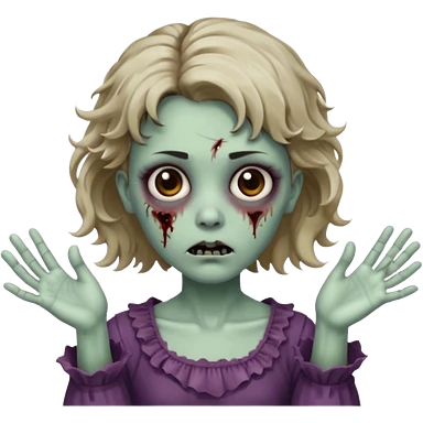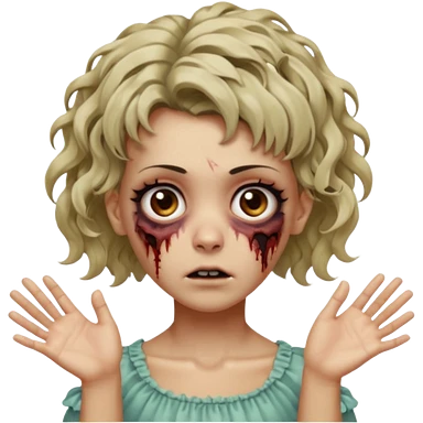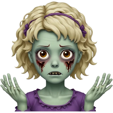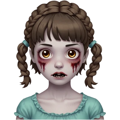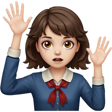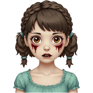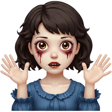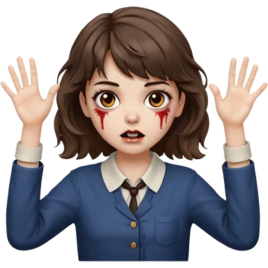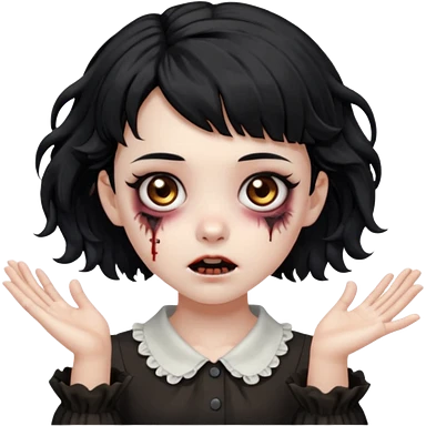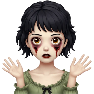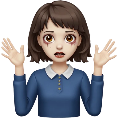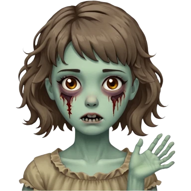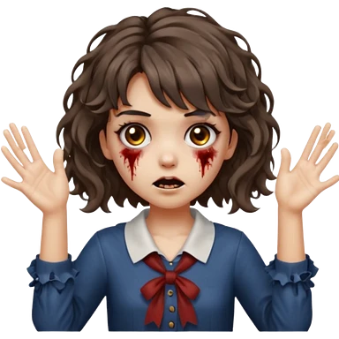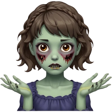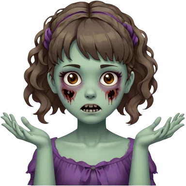 Cabelo ondulado um pouco cheio e franja curta Olhos marrons e pequenos e feita d ezumbi mais bonita com cabelo amarro na e com as mãos assim tipo assim🧟♀️ emoji