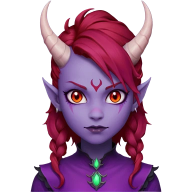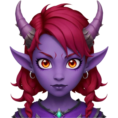 Demon Girl Purple Skin Dragon Horns Black Eyes Red Glowing Pupils Auburn Haired Red Shirt emoji