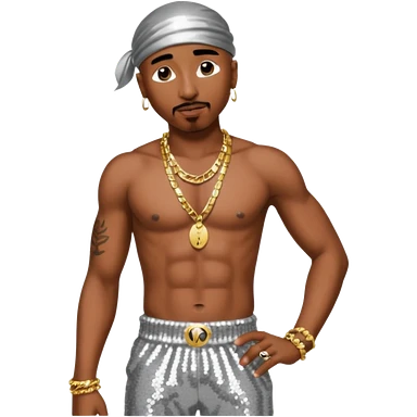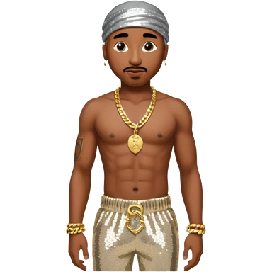 Tupac with silver sequin harem pants, shirtless with necklace emoji