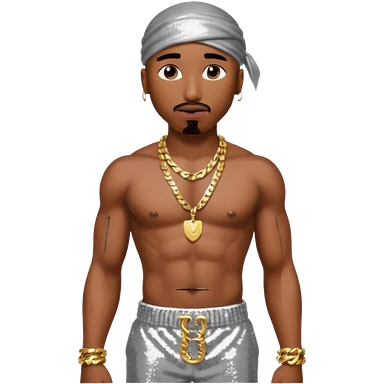 Tupac with white sequin baggy pants, shirtless with necklace emoji