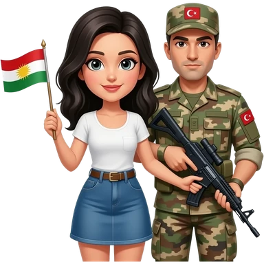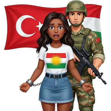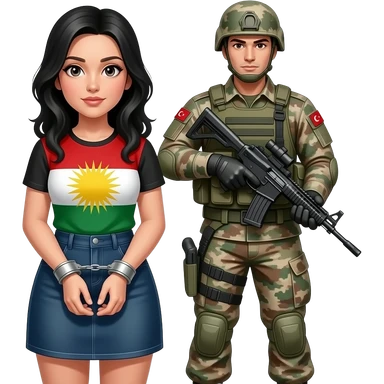 Kelepçeli siyah saçlı beyaz tenli ve mini etekli Kürdistan bayrağı giyen bir kadın ve arkasında onu kelepçeleyen bir Türk askeri +18 emoji