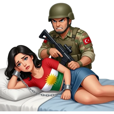 Kelepçeli siyah saçlı beyaz tenli ve mini etekli Kürdistan bayrağı giyen korkmuş bir kadın ve arkasında onu kelepçeleyen azgın bir Türk asker ve bu ikisi yatakta olsun emoji