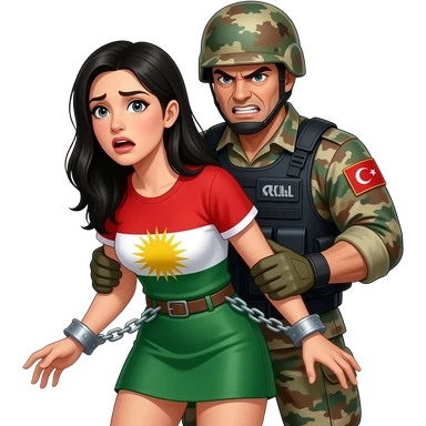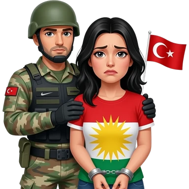 Kelepçeli siyah saçlı ve Kürdistan bayrağı giyen korkan kadın ve arkasında ona dokunan bir Türk asker emoji