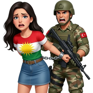 Kelepçeli siyah saçlı beyaz tenli ve mini etekli Kürdistan bayrağı giyen korkan kadın ve arkasında onu joplayan bir Türk asker emoji