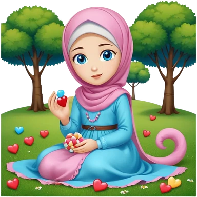 Turkish beautiful finish Konya girl blue eyes with candy hijab long tail dress and sits on the grass on the ground and sends hearts with her hand emoji | AI Emoji Generator