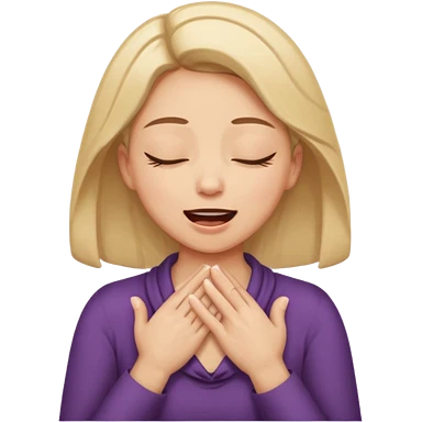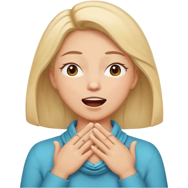 Happy blonde girl with eyes closed and mouth wide open and hands cupped around her neck - her eyes are squinty with excitment mo emoji