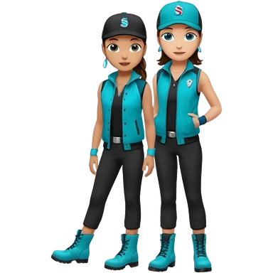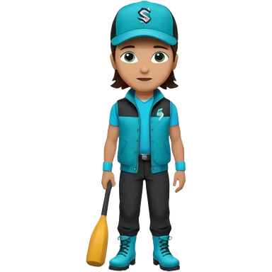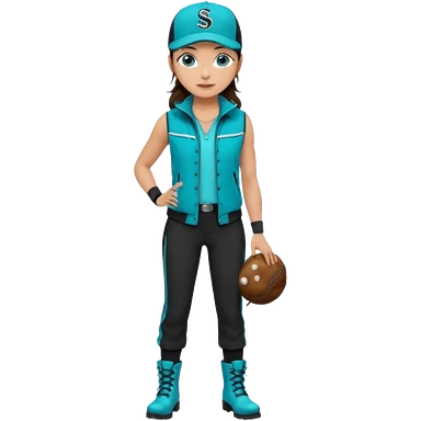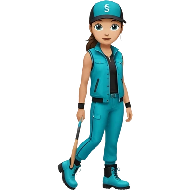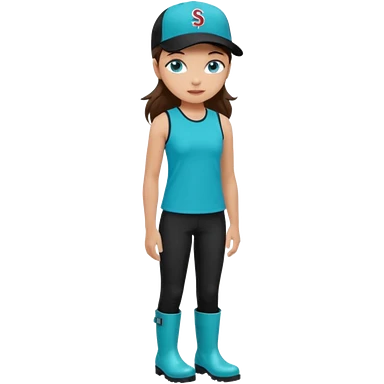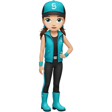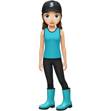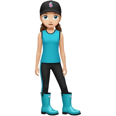 A landscaper in a beautiful turquoise longsleve and turquoise rubber boots, black pants, and a black sleeveless shirt. On her head is a black color Swissotel baseball cap. The girl is a brunette with blue eyes. emoji