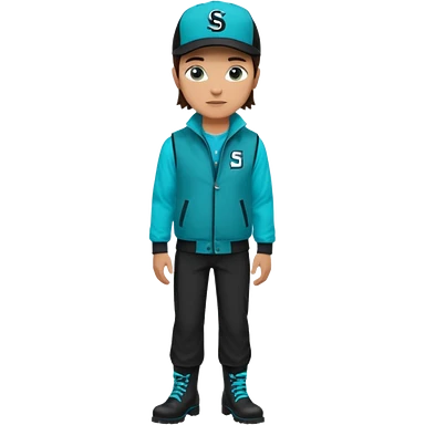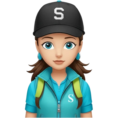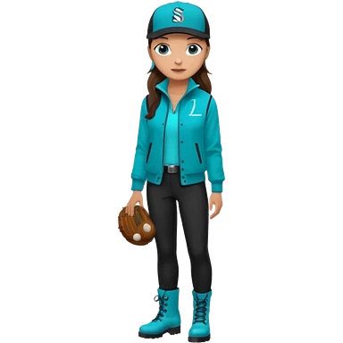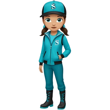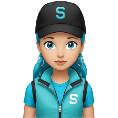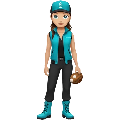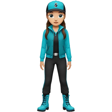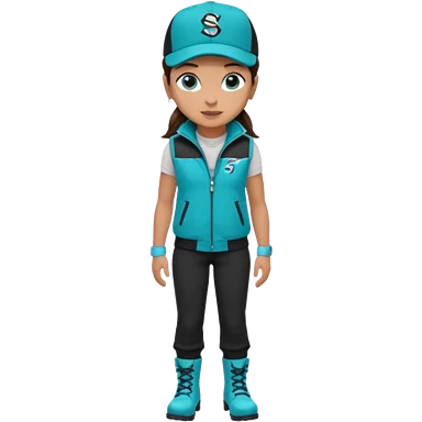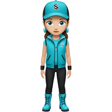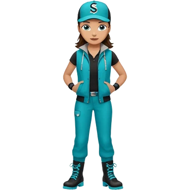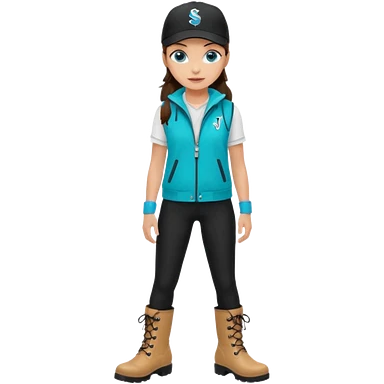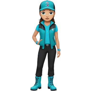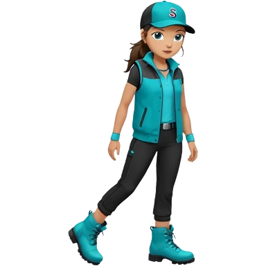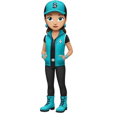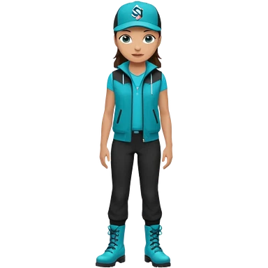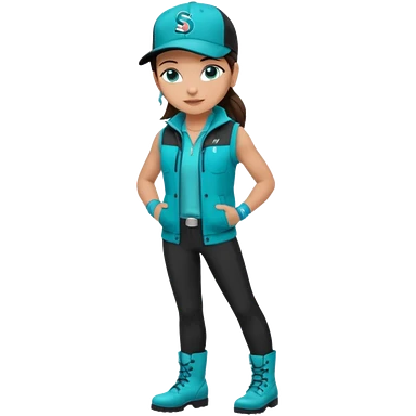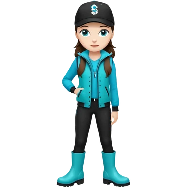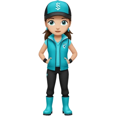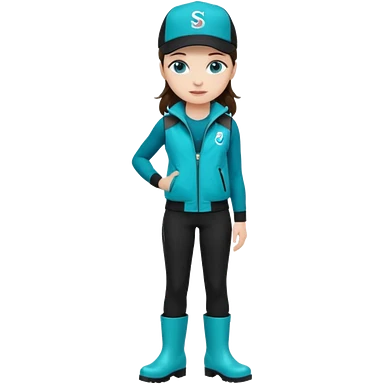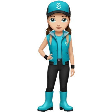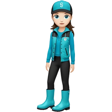 A landscaper in a beautiful turquoise jacket, turquoise rubber boots, and black pants. Over the turquoise jacket, she wears a black sleeveless vest. On her head, she wears a black Swissotel baseball cap. The girl is a brunette with blue eyes. emoji